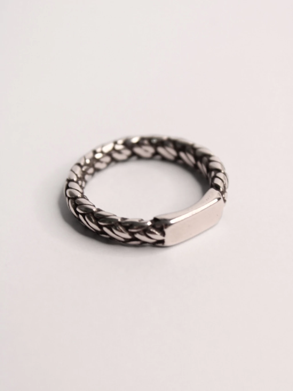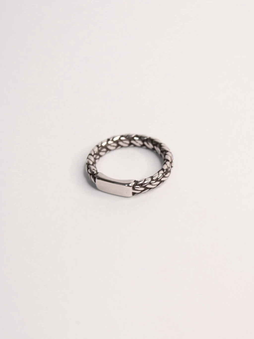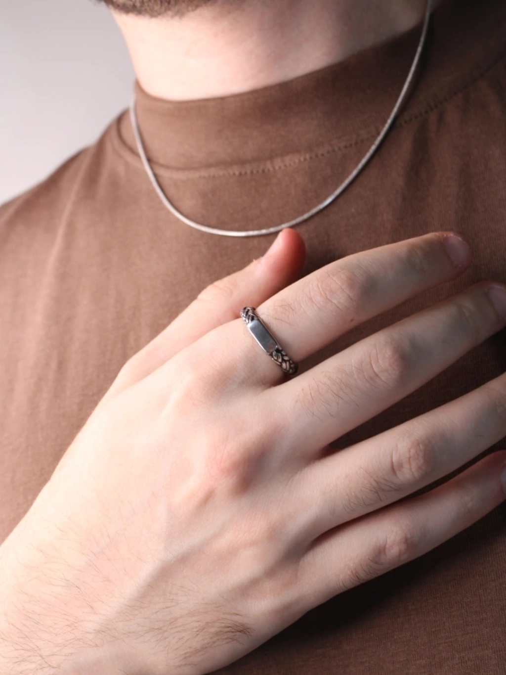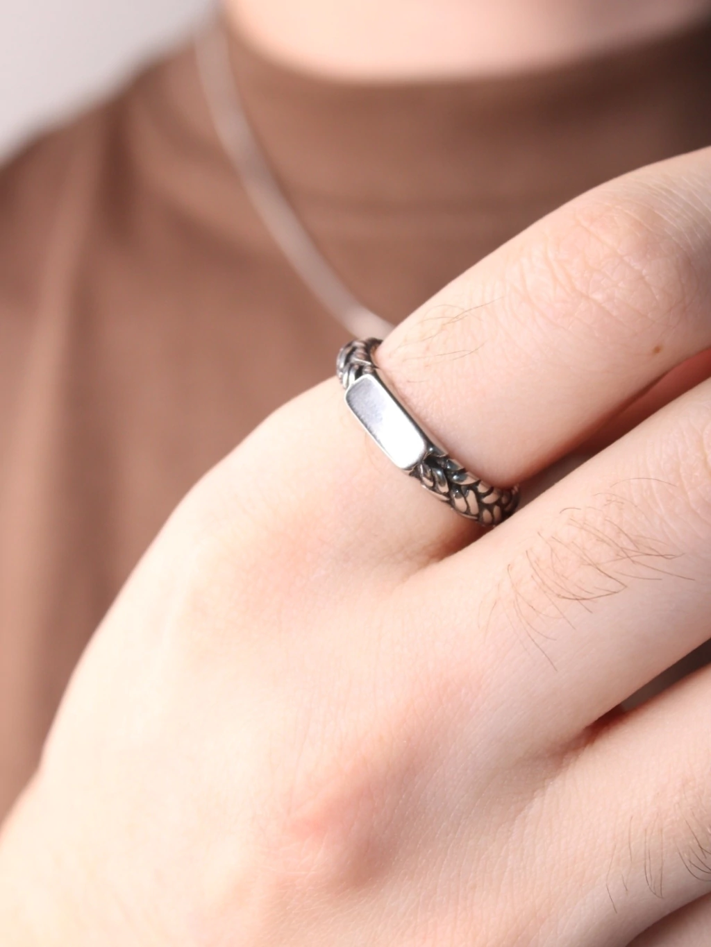 O nosso anel Cave possui um design slim, com detalhes trançados e um retangulo minimalista no centro, o que torna ele minimalista e adaptável para qualquer visaul.