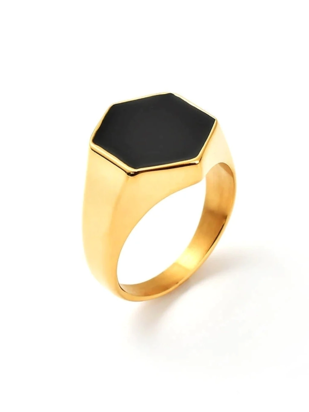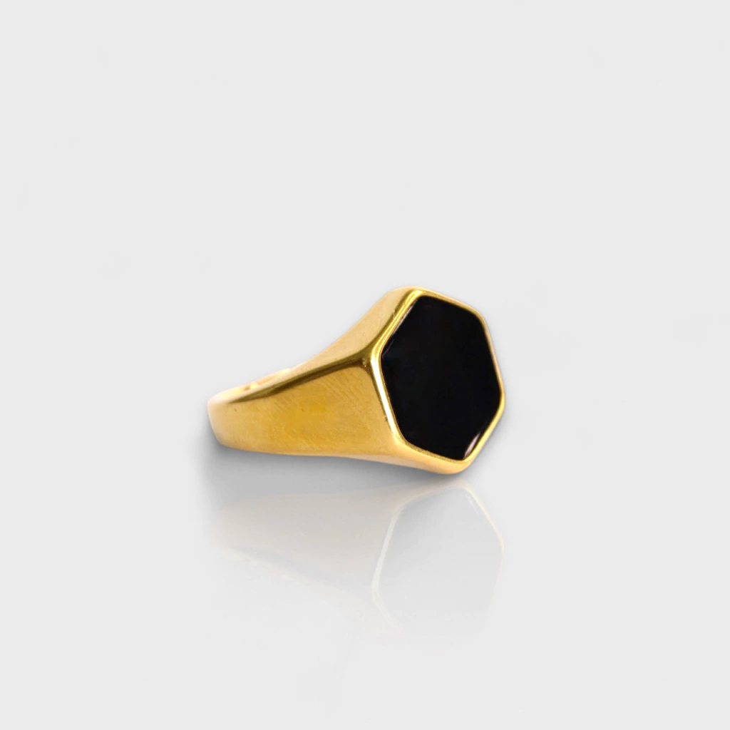 Um anel que traz sensação de poder e confiança através da sua cor dourada e formato hexagonal, feito especialmente para homens que desjam transmitir um visual que marque presença.