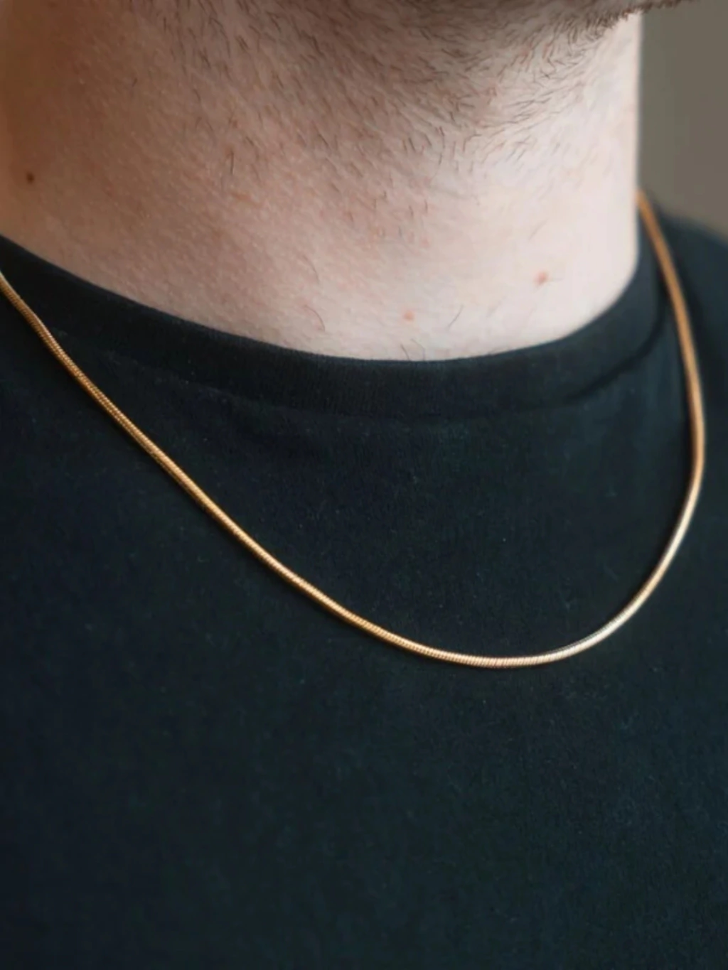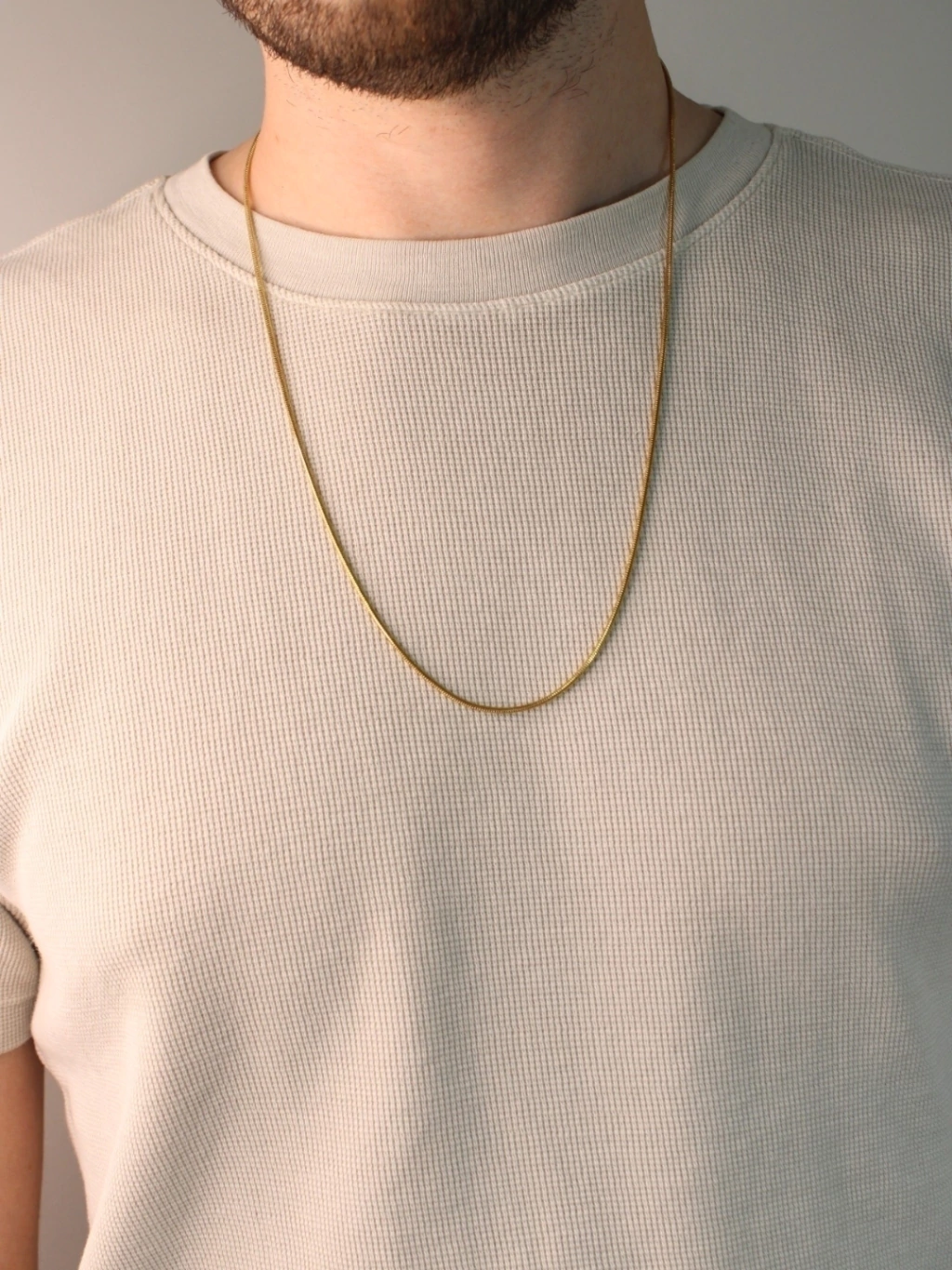 Uma corrente no estilo "Rabo de Rato", um dos mais clássicos e versáteis. Por ser uma corrente mais fina e com um elo brilhante, combina com um estilo mais discreto ou fazendo composição com outros colares e correntes.