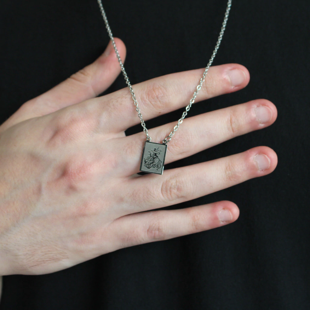 Em um dos lados possui a imagem de São Jorge com acabamento escovado. Do outro lado, a cruz de São Jorge com detalhes vazados, trazendo um design único.