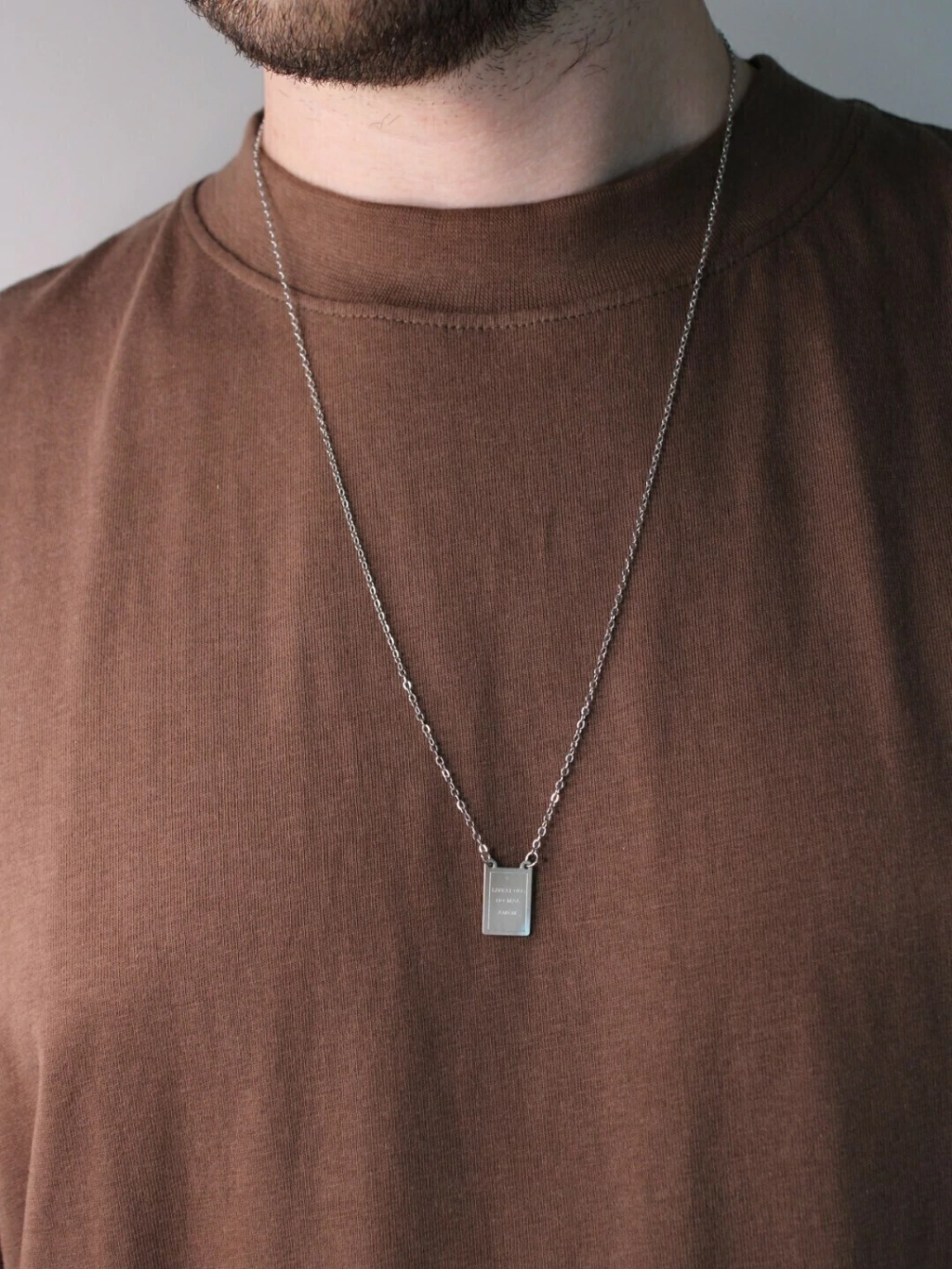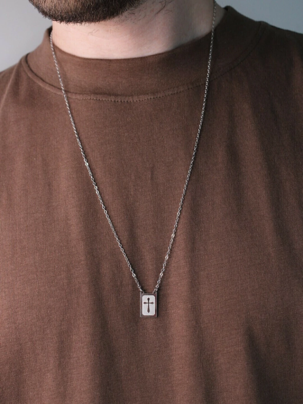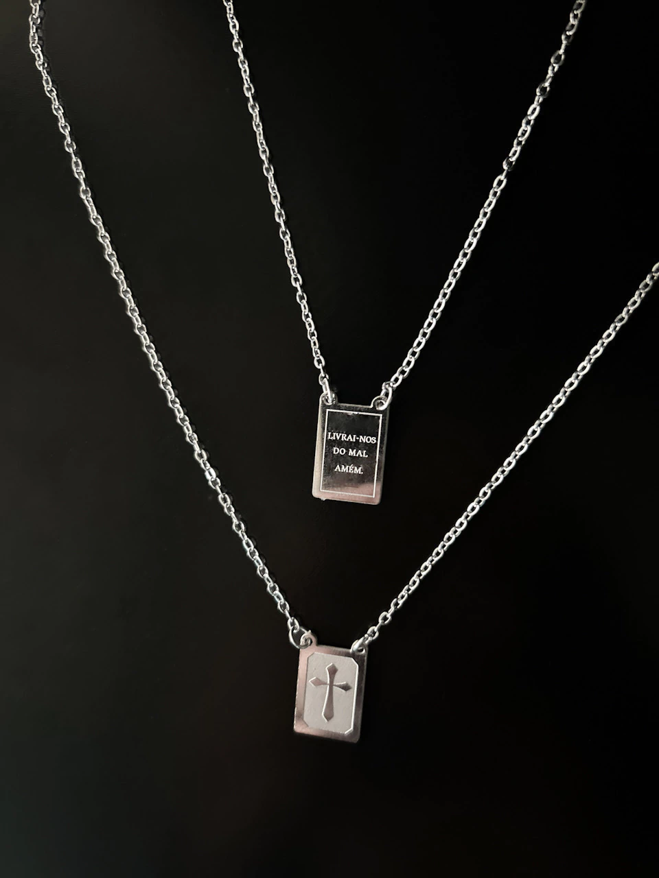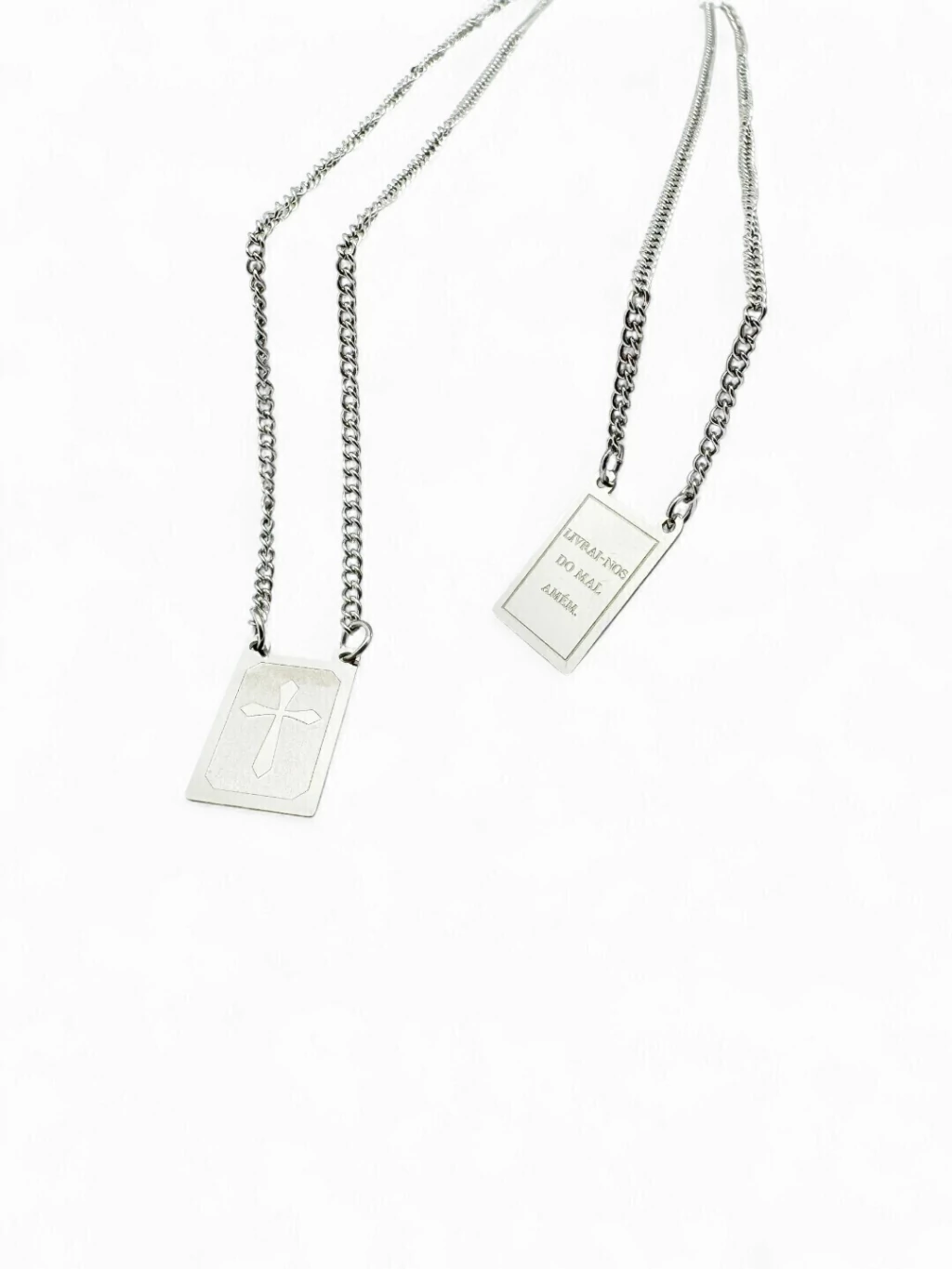 Sinônimo de proteção e estilo, o escapulário de Mateus possui seu lado principal como cruz, e seu outro lado com a frase "Livrai nos do mal, amém", perfeito para agregar valor ao seu visual e ser um amuleto para todos os momentos.
