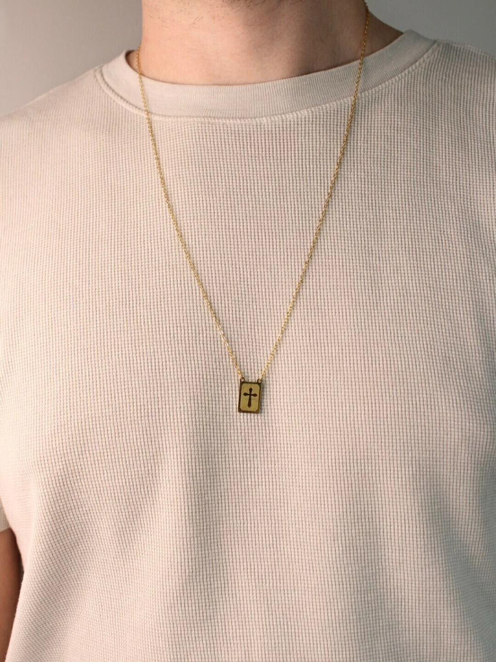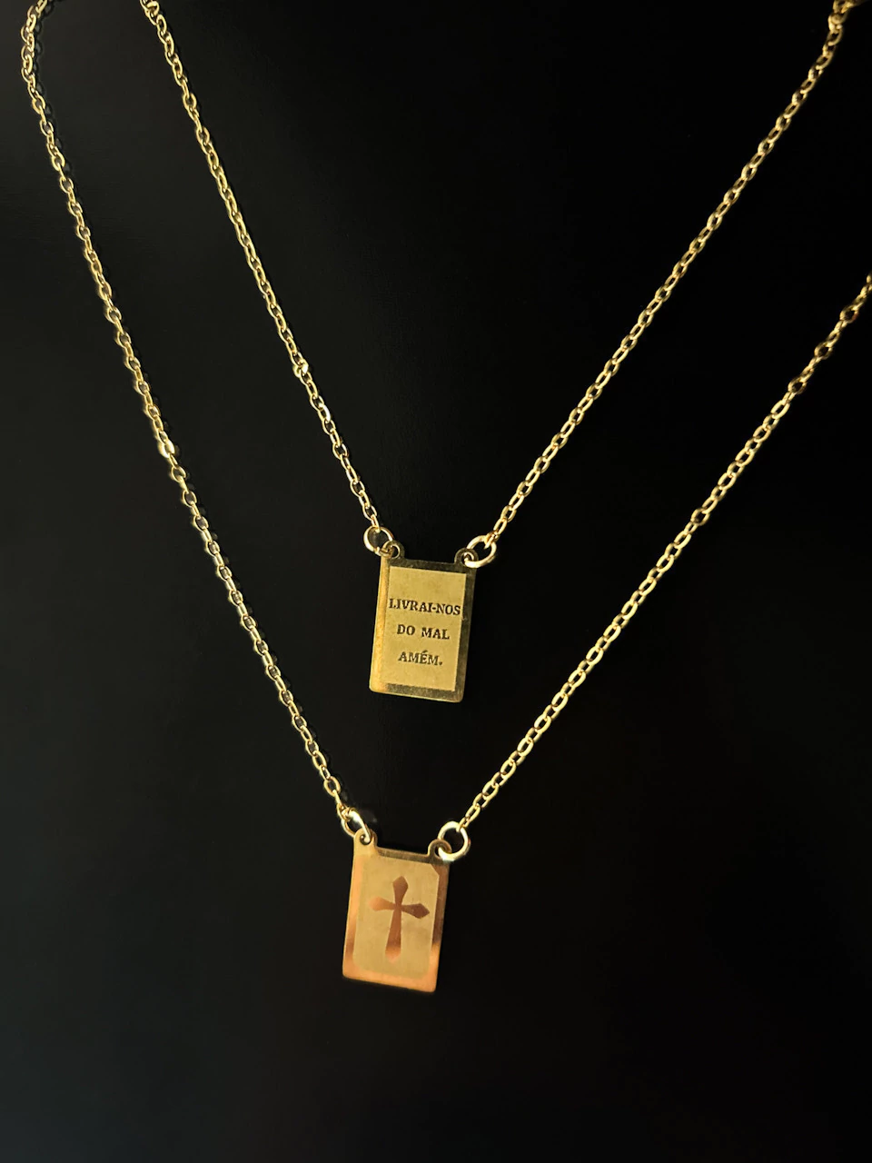 Sinônimo de proteção e estilo, o escapulário de Mateus possui seu lado principal como cruz, e seu outro lado com a frase "Livrai nos do mal, amém", perfeito para agregar valor ao seu visual e ser um amuleto para todos os momentos.